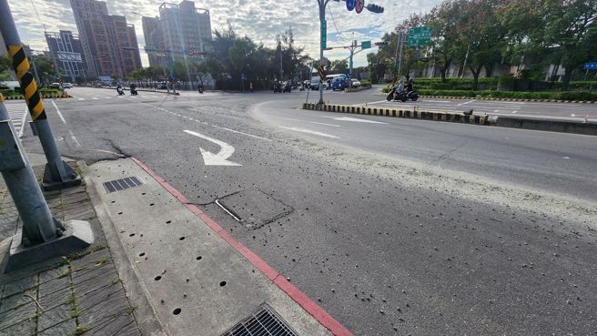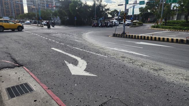 因為慣性而溢出,造成該路口大量砂石掉落,讓很多民眾行經時都相當緊張,很怕輾到碎