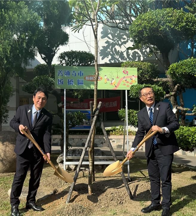 善通寺市市長辻村修(左)與板橋區長陳奇正(右)在公所前一同種植台灣原生種「八重