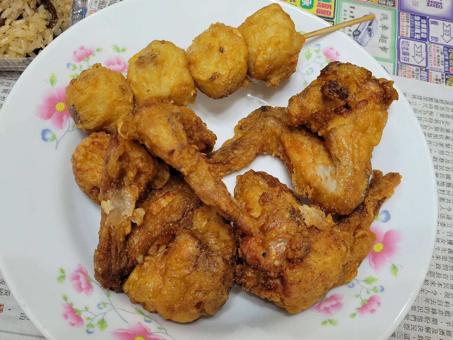 澀,雞翅或雞腿均無肉汁,雞腿近骨處帶血色。花枝丸軟彈,
