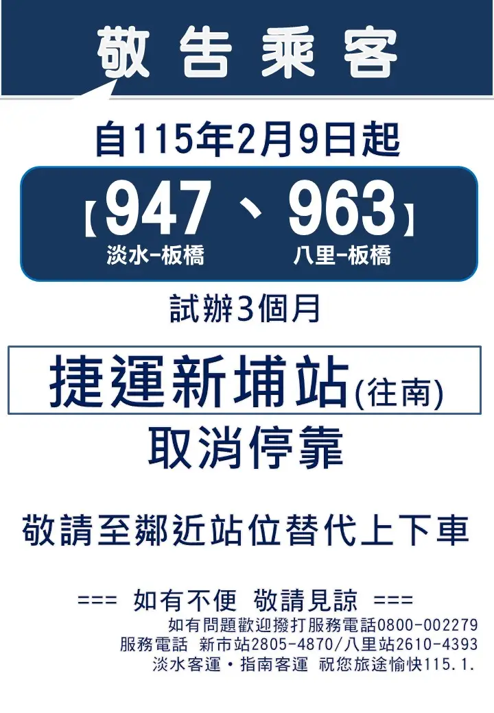 自115年2月9日起,947(淡水—板橋)、963(八里—板橋)