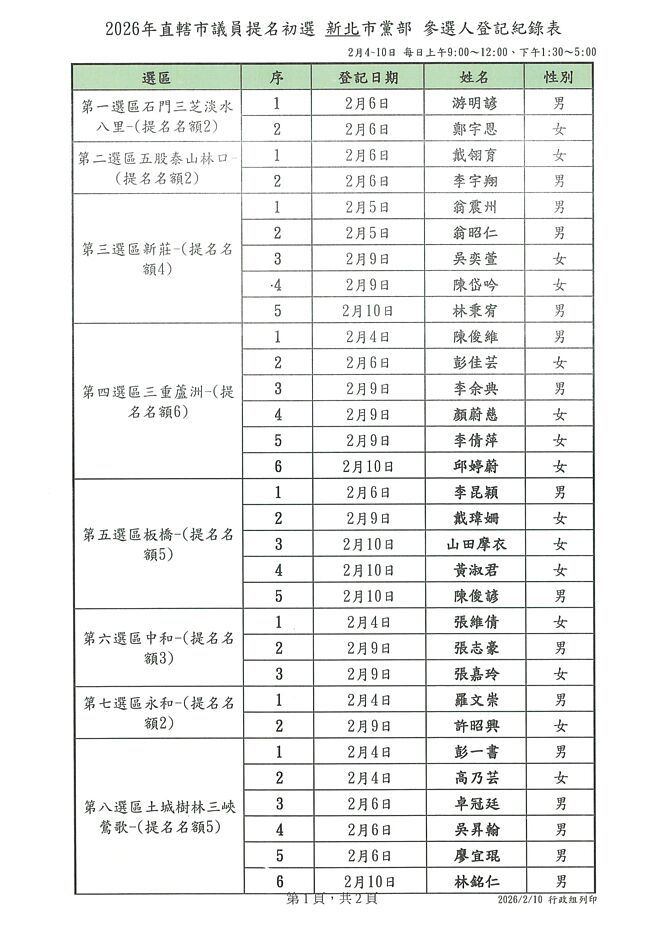 根據市黨部統計完成登領表登記,第1選區(石門、三芝、淡水、八里)鄭宇恩、游明諺