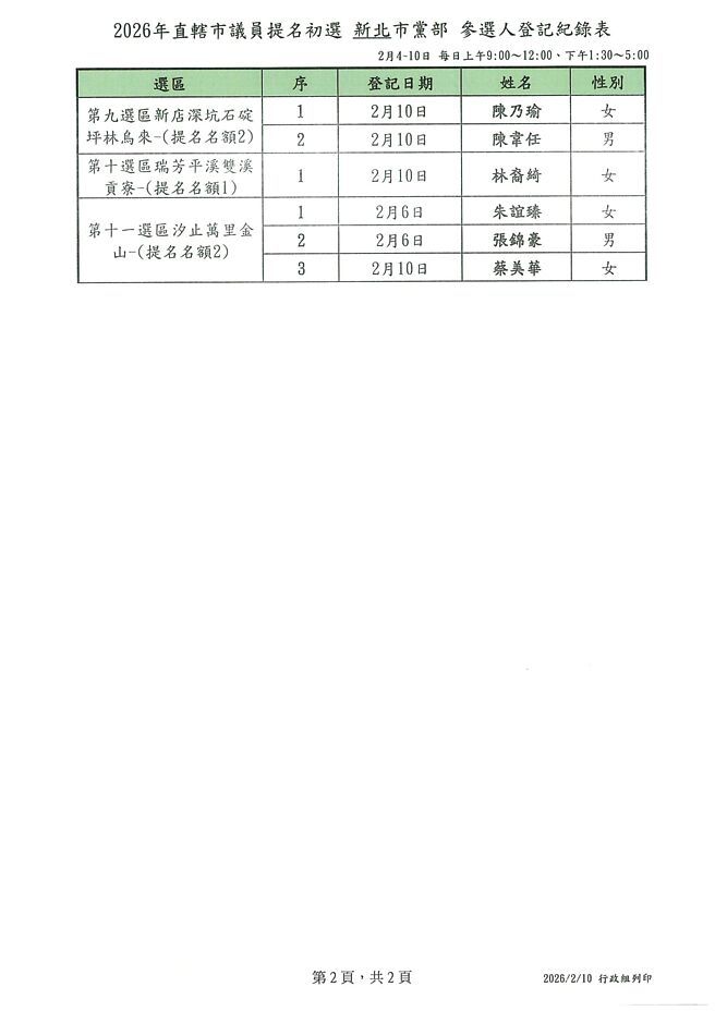 林、烏來)陳乃瑜、陳韋任;第10選區(瑞芳、平溪、雙溪、貢寮)林裔綺;第11選區蔡
