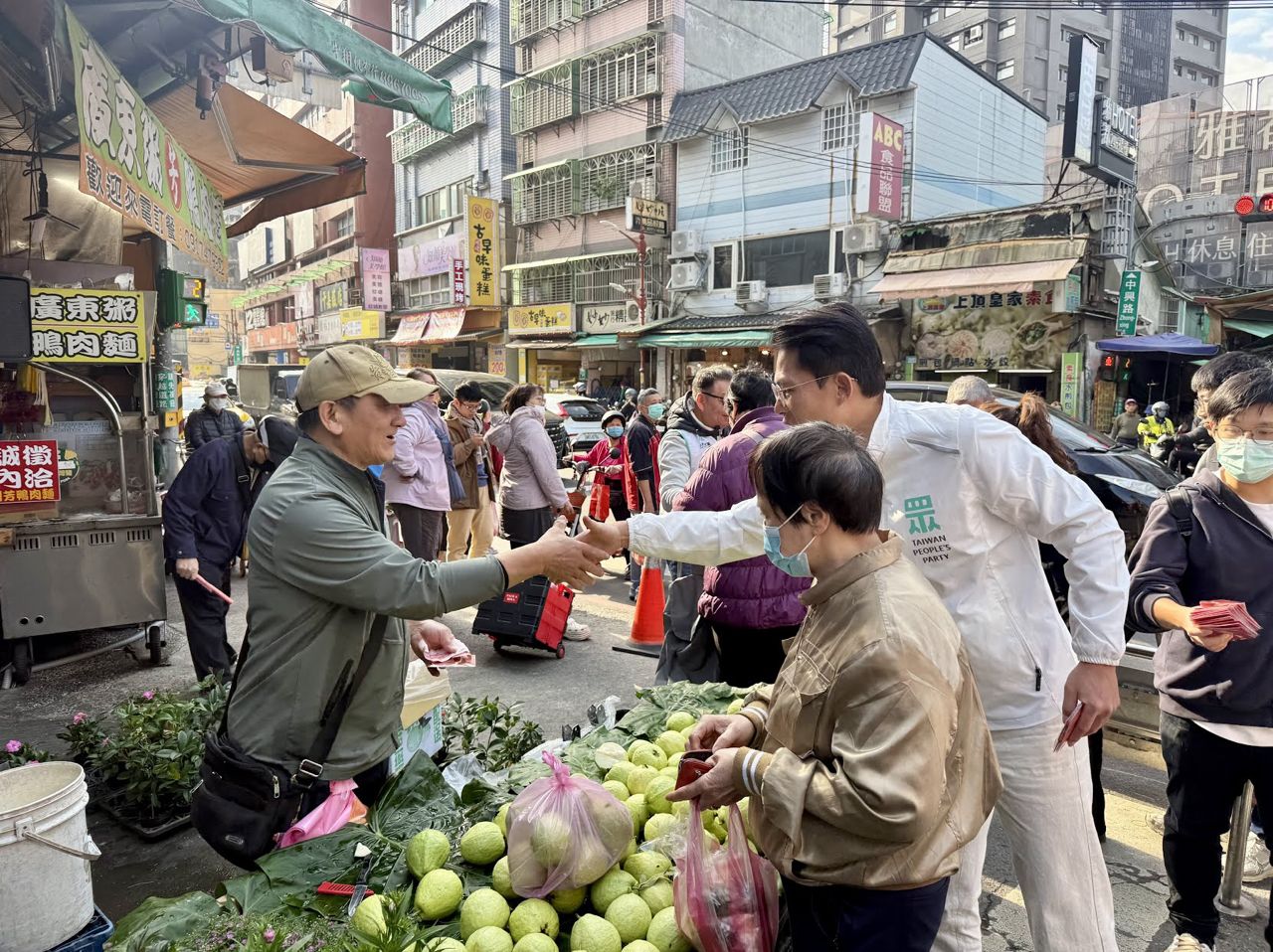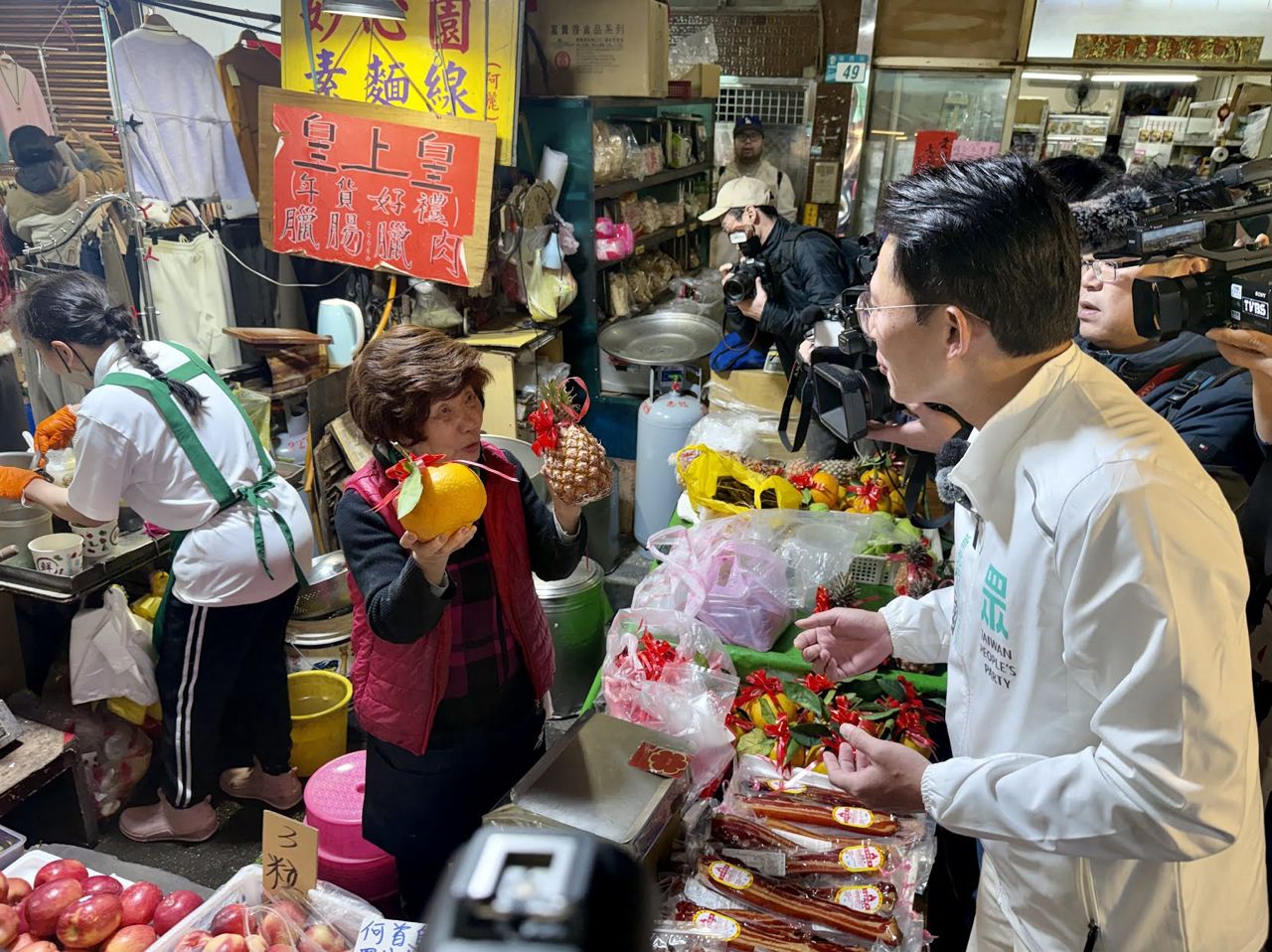 黃國昌一行人進入市場後,沿途逐攤致意,不少攤商主動招呼寒暄,有人送上水果、點心