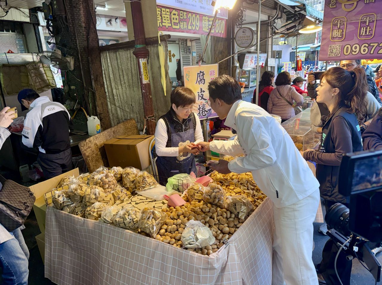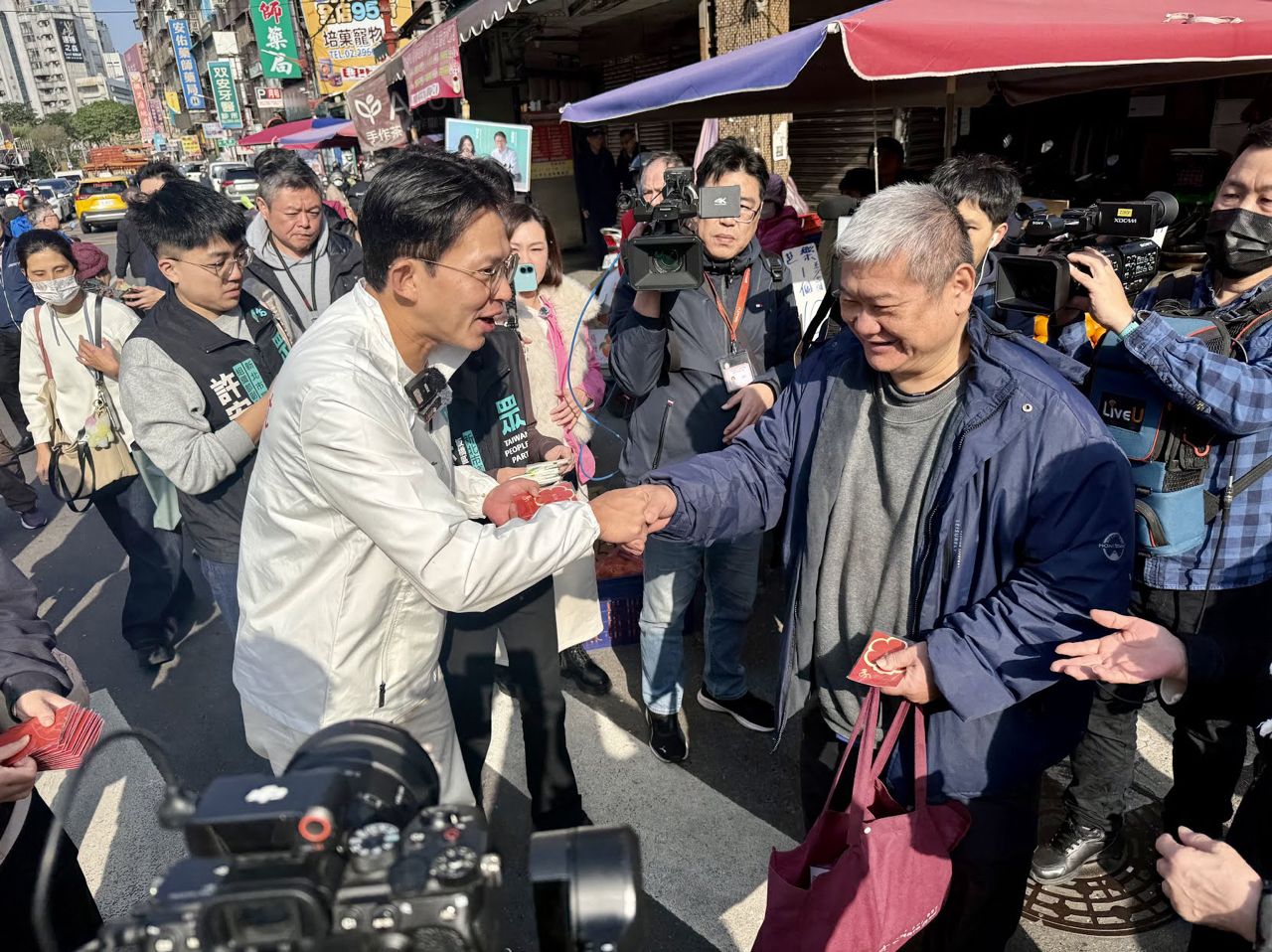 現場不少民眾主動上前握手、合照,攤商熱情打氣,還有人送出自家商品為他加油,氣氛