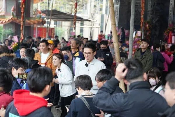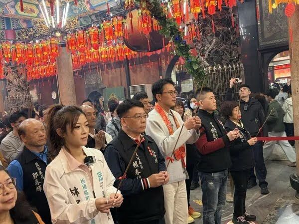 黃國昌初一上午先赴新莊武聖廟發送福袋,下午轉往板橋慈惠宮參香。