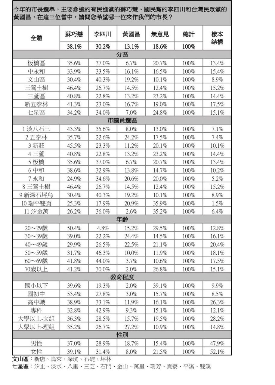,李四川支持度為30.2%、蘇巧慧為38.1%,而黃國昌為13.1%。