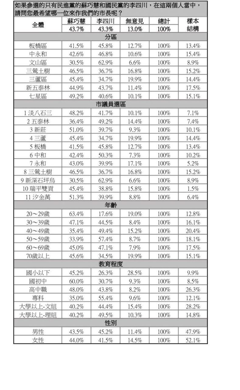 蘇巧慧也有43.7%,這也是蘇巧慧首次微幅超前李四川,雙方戰況陷入膠著;而若是蘇巧