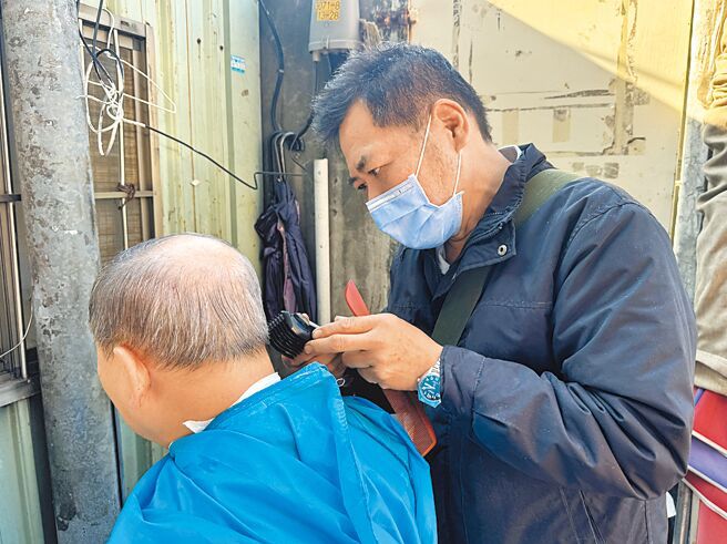 著一大包理髮工具,在不到1坪的小空間內替民眾理髮,天熱就用陽傘遮陽、天冷就拉塑