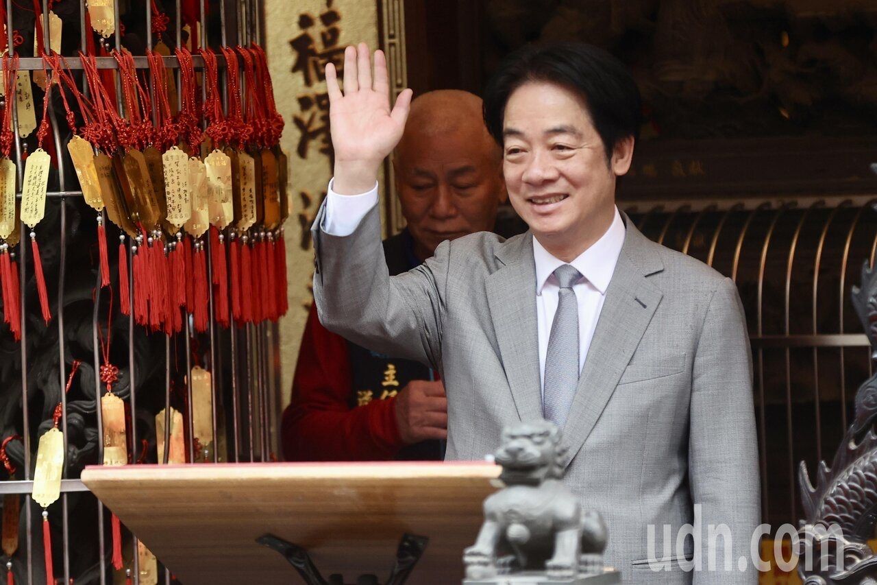 賴清德總統(右二)上午前往板橋區大井福德祠參拜後,與民眾揮手致意。記者陳正興/
