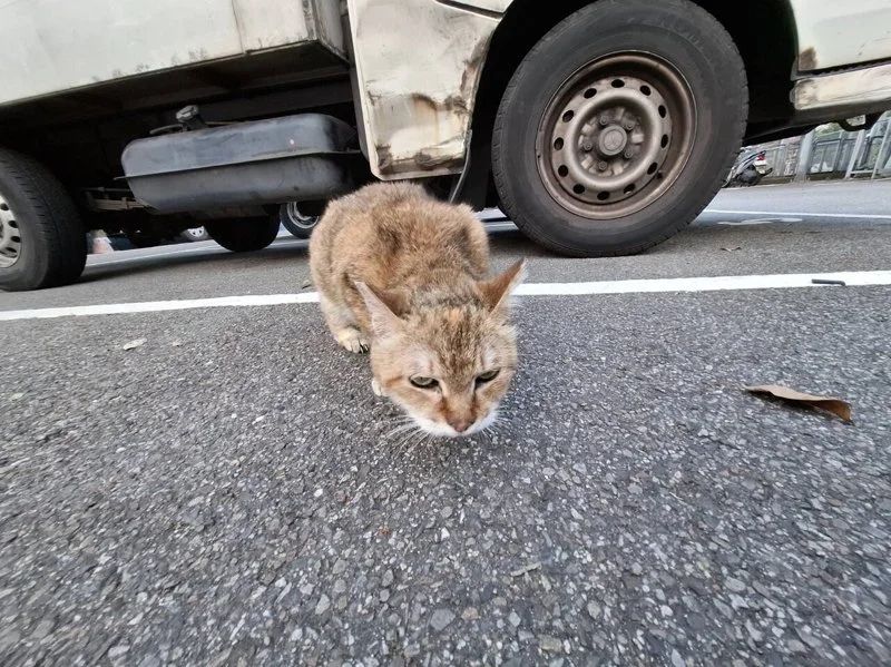 新北市板橋區日前有民眾通報,中山路巷內有一隻浪貓瘦弱地呆坐在車道中央,周邊車輛
