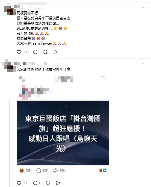 起打開窗戶大唱島嶼天光,所有日本人都被我們感動到一起合唱」,此舉引發綠營支持者