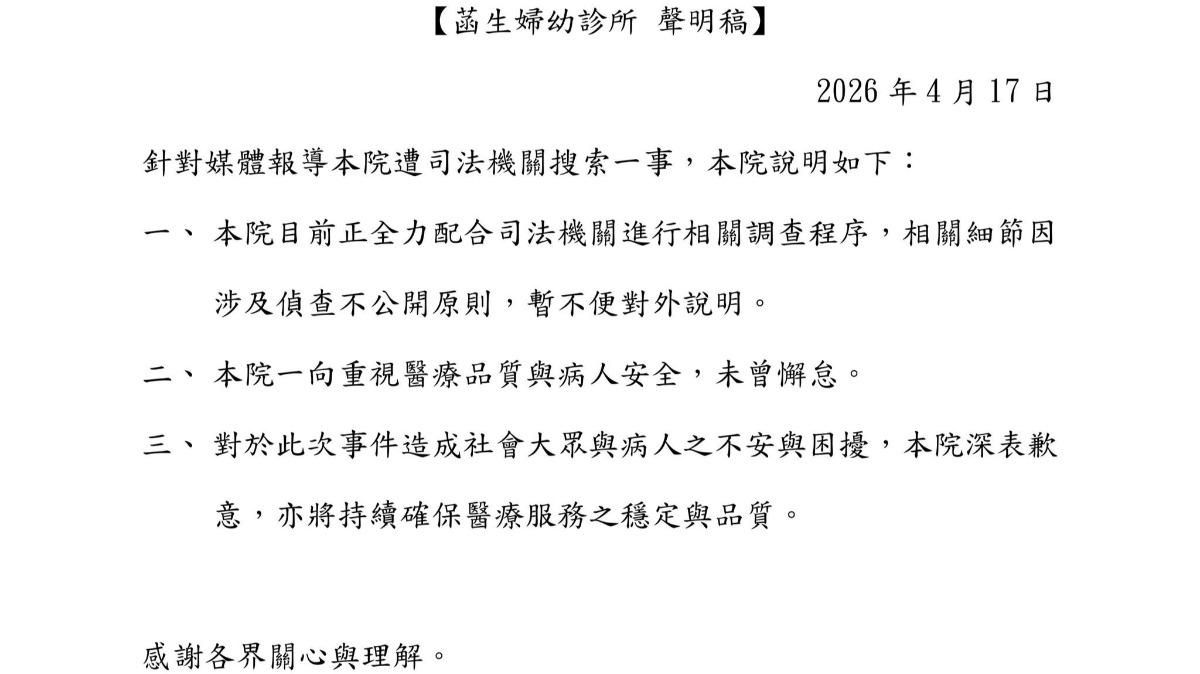 菡生婦幼診所今(17)日發出3點聲明,表示目前正全力配合調查,對於此事件造成社會