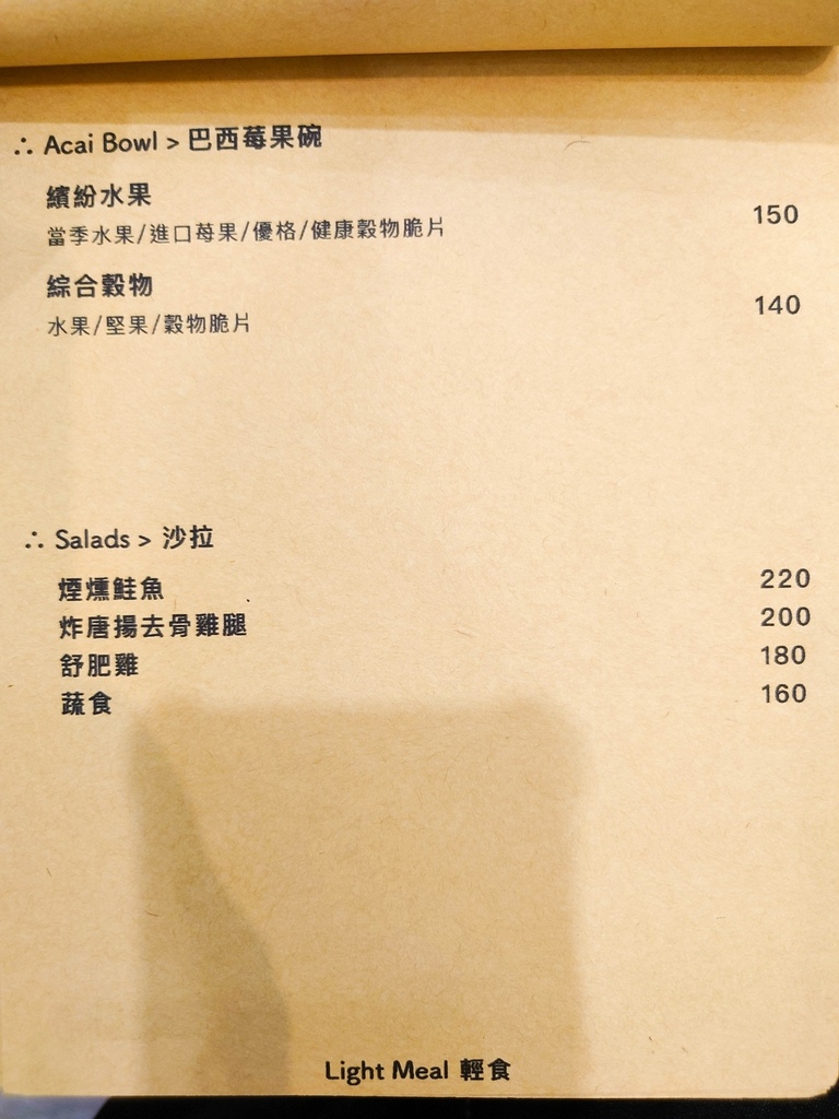 供應的餐點有英式早餐盤、班尼迪克蛋、漢堡、咖哩飯、藜麥飯、巴西莓果碗、沙拉等,