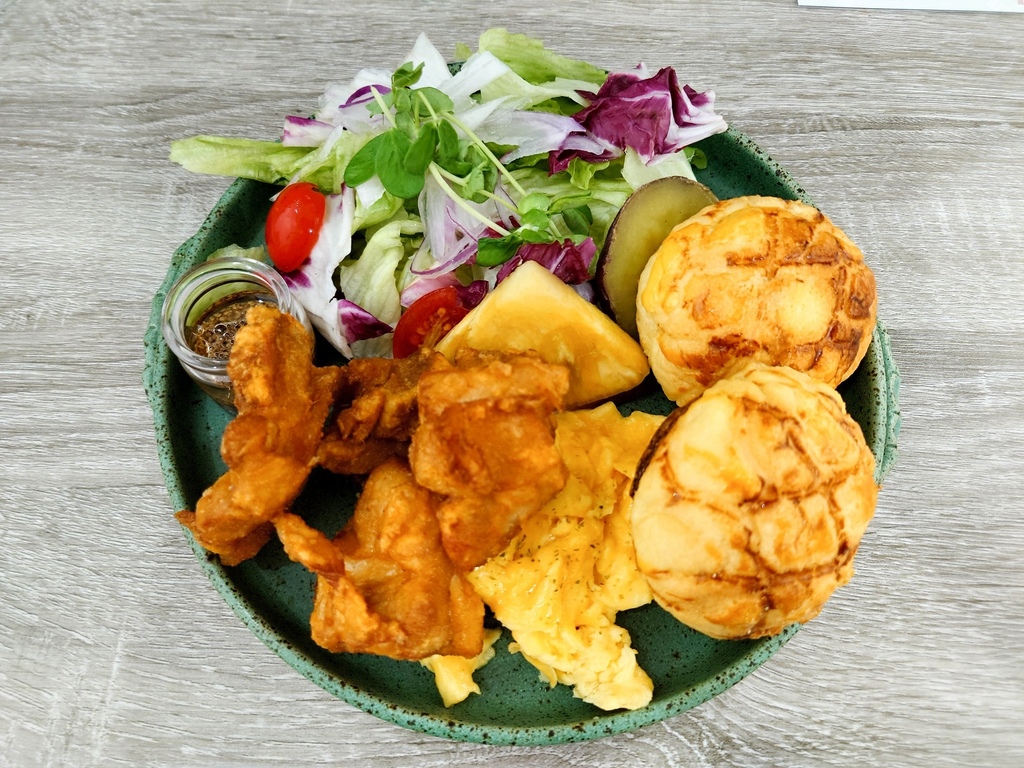 整份早午餐有唐揚炸雞、 美式炒蛋、沙拉、菠蘿麵包,