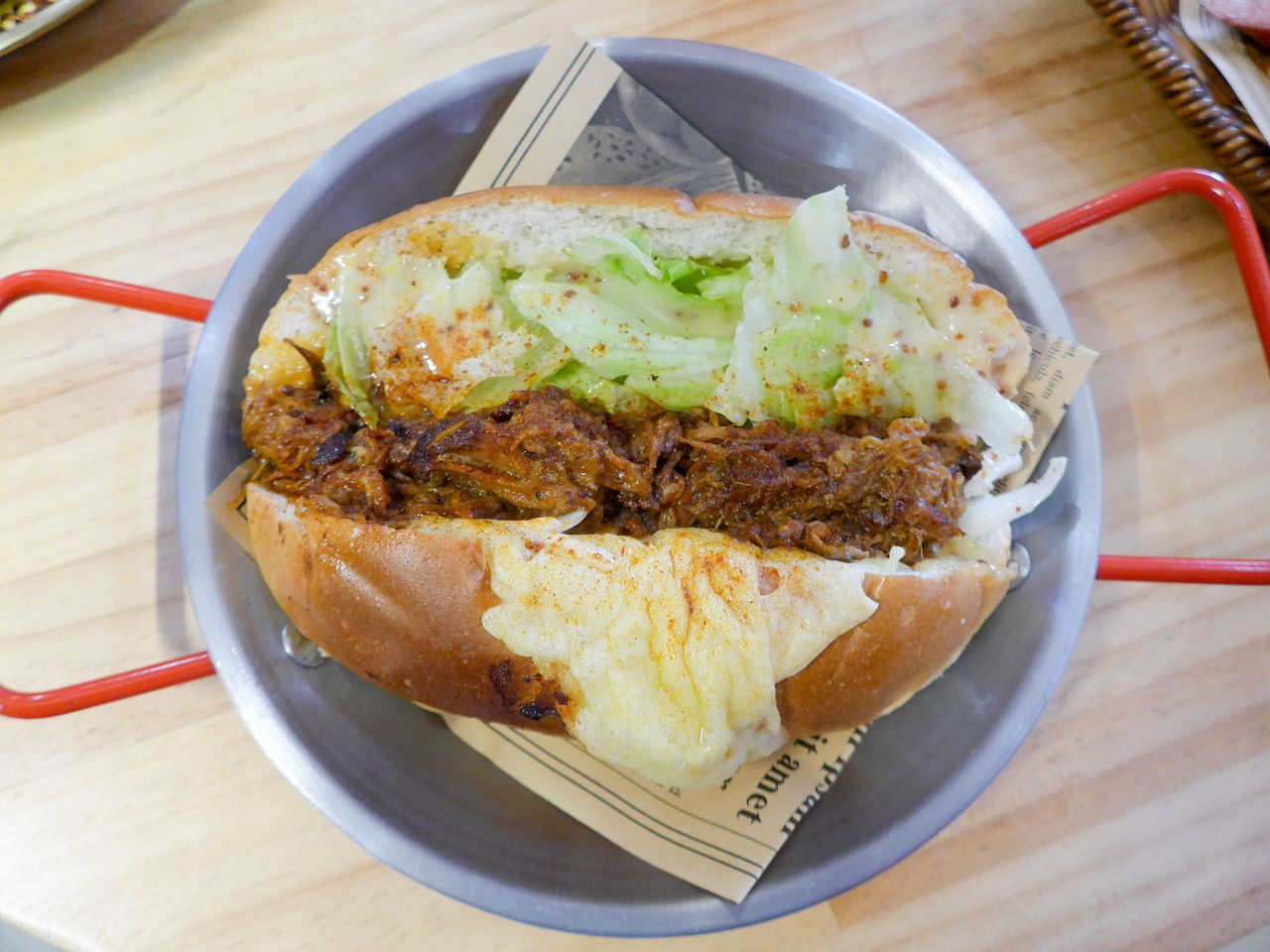 麵包夾入手撕豬肉、洋蔥、生菜、番茄、艾曼塔起司,