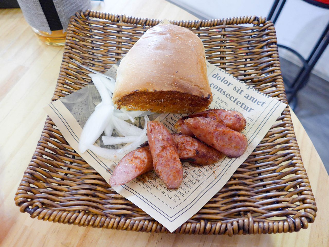 有德國香腸一條、大蒜麵包半塊、桑格利亞一杯。
