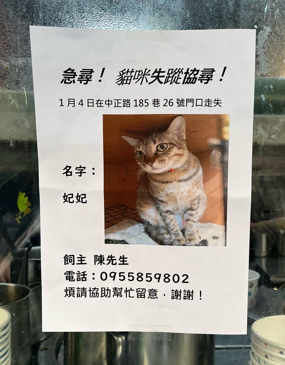 今天中午在中正路185巷沿路看到尋貓公告,