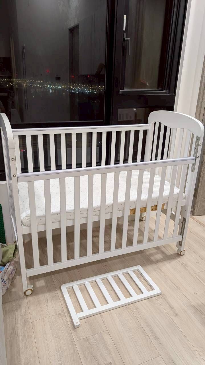 嬰兒床尺寸約60*120,附輪子*4(其中一顆輪子固定器斷掉但不影響滑動),小圍欄,床墊
