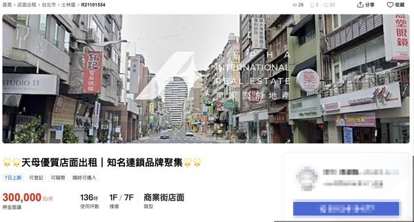經查《591房屋交易網》,天母西路上有一間1樓+B1的店面刊租,權狀面積登記136坪,研