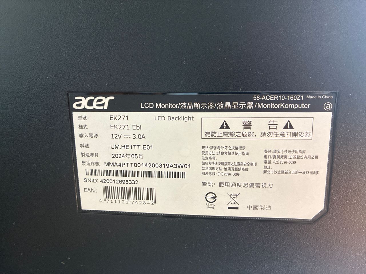 出售物:acer 27" 螢幕 EK271