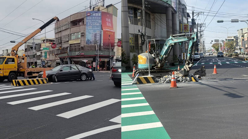圖左是民車自撞庇護島;圖右是包商優化庇護島,敲掉後縮短其長度。(照片由縣議員鄭