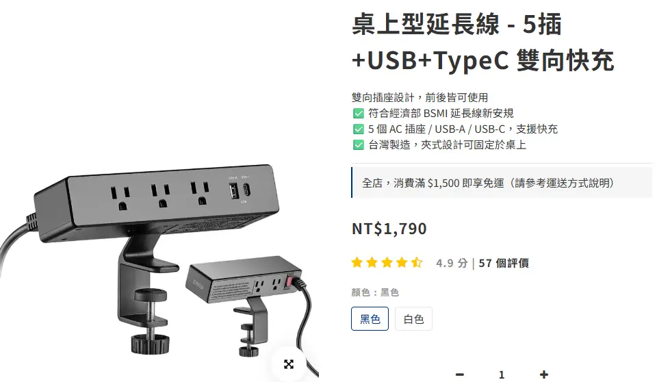 出售物:夾式桌上型延長線-5插USB+type C雙向快充-黑色