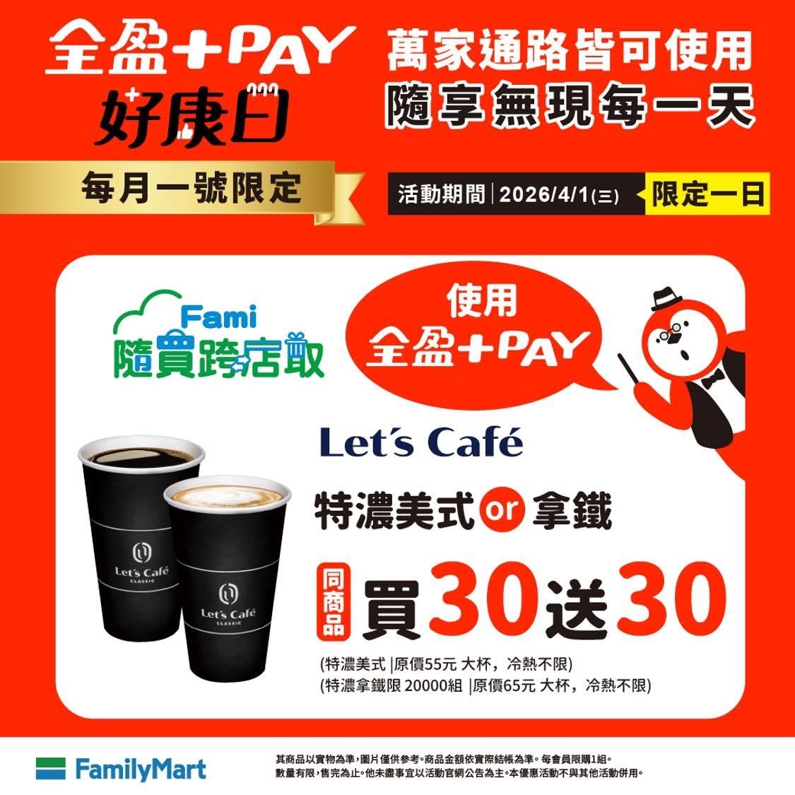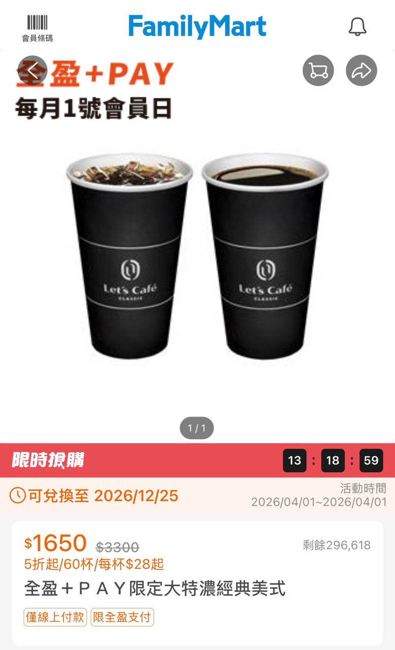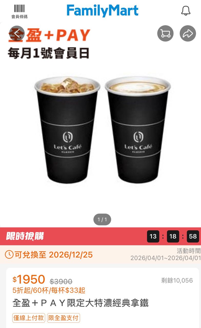 出售物:全家特濃拿鐵、美式