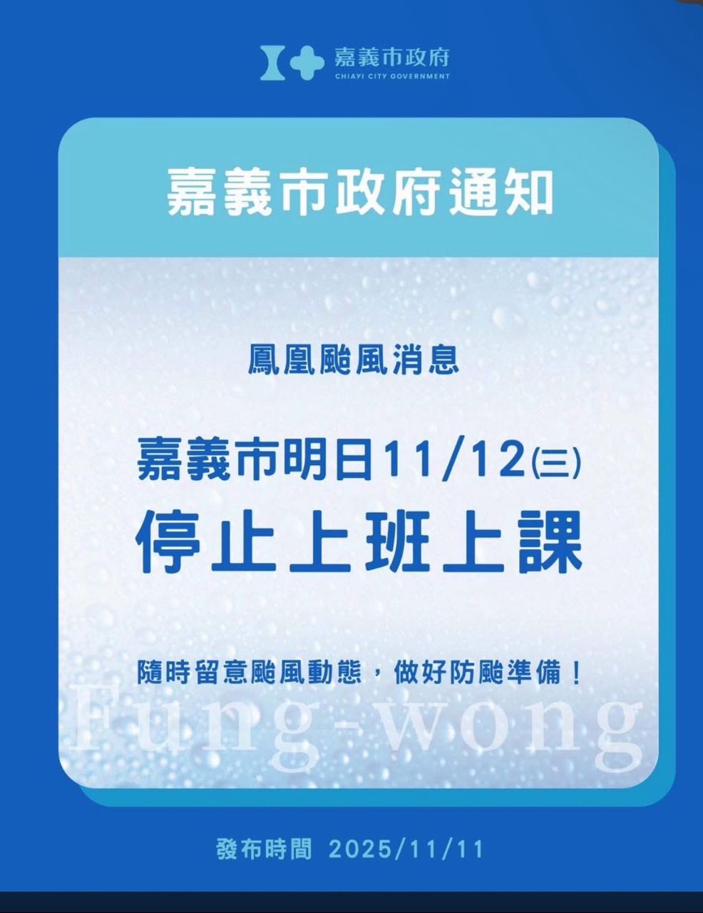 嘉義縣政府公告11月12日(星期三)停止上班、停止上課