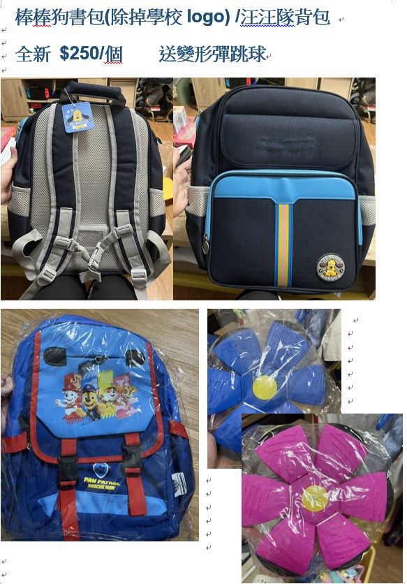 2.棒棒狗書包(除掉學校logo) /汪汪隊背包 全新 $250/個 送變形彈跳球