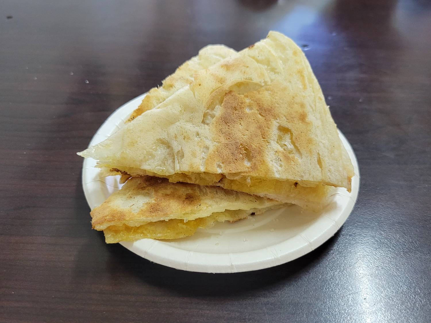 甜烤餅,內餡為生菜絲與咖哩肉末。肉末稍乾,咖哩味溫和。