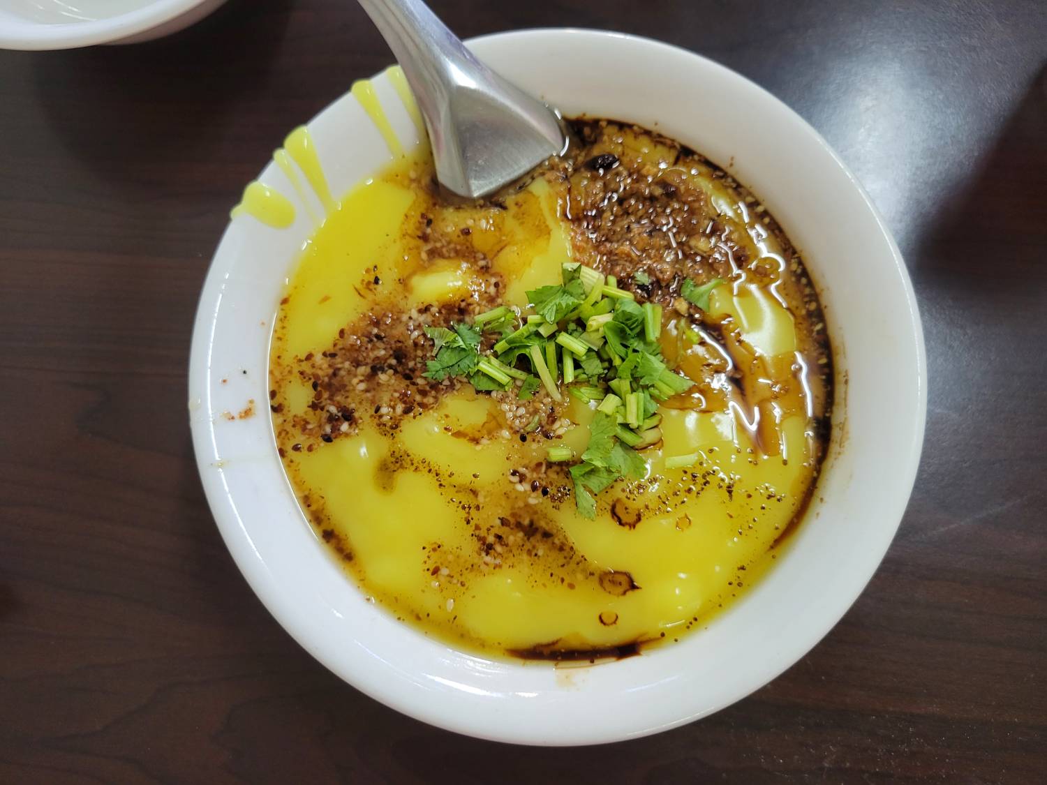 些煮得很黏稠的玉米濃湯(非貶意)。調味檯上有油潑辣子,