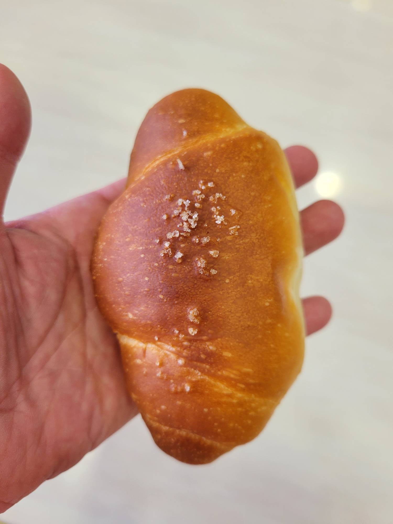 鹽可頌買到剛出爐的版本。麵包有嚼勁,底部烤出酥度,