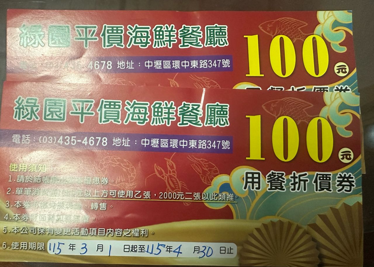 過年除夕吃飯 獲得折價卷100元兩張 因為到月底