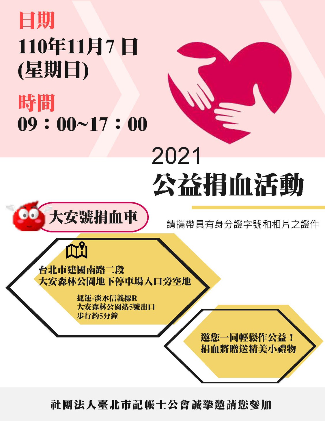 11/07 (日): 大安號捐血車(大安森林公園地下停車場入口旁) 09:00-17:00