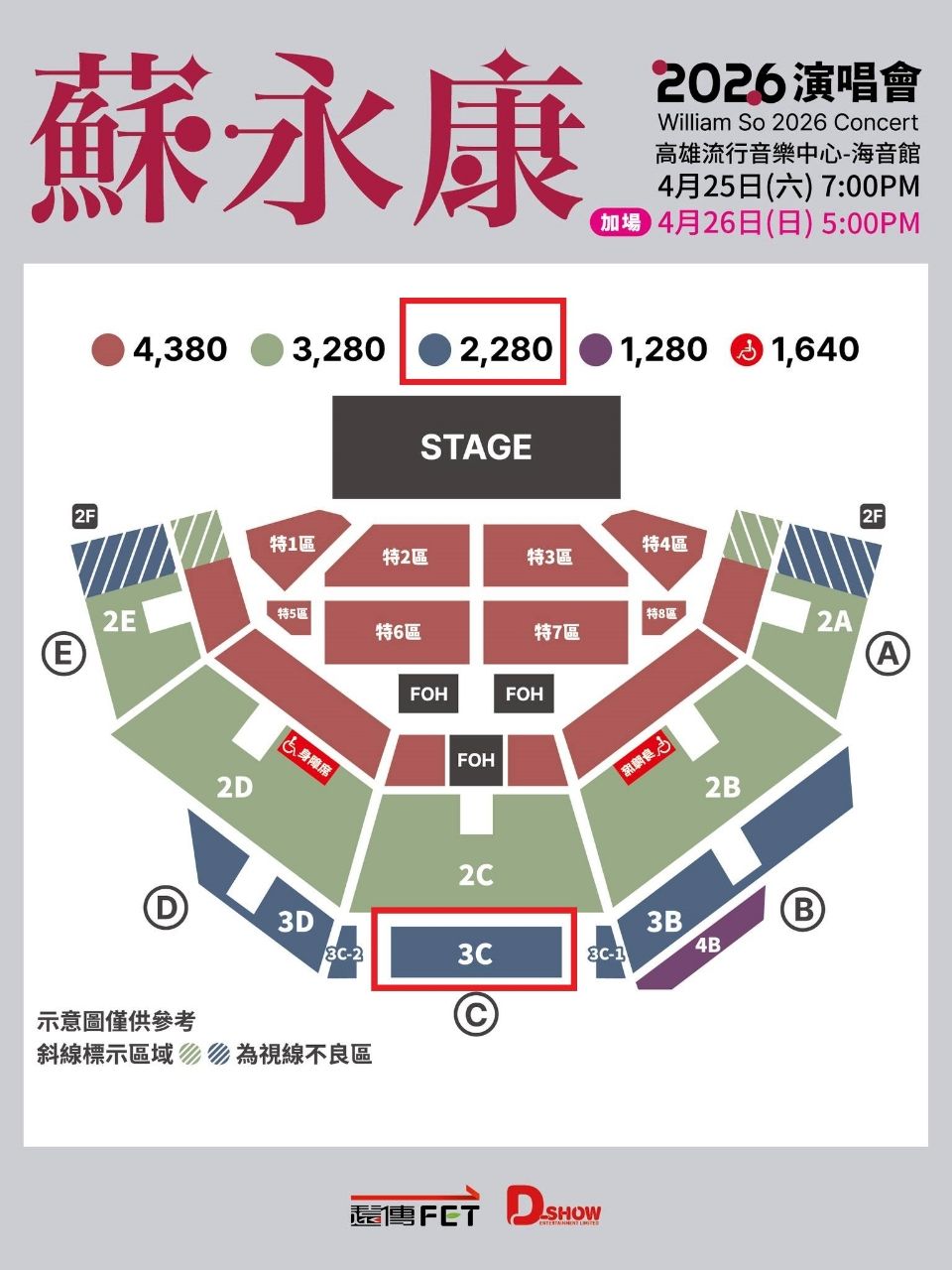 票別:全票座位:2樓3C區2280,連號兩張