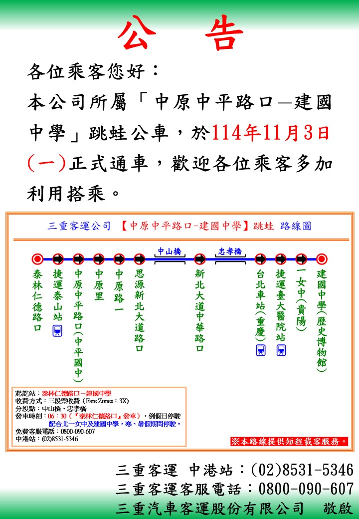 三重客運所屬「中原中平路口→建國中學」跳蛙公車,