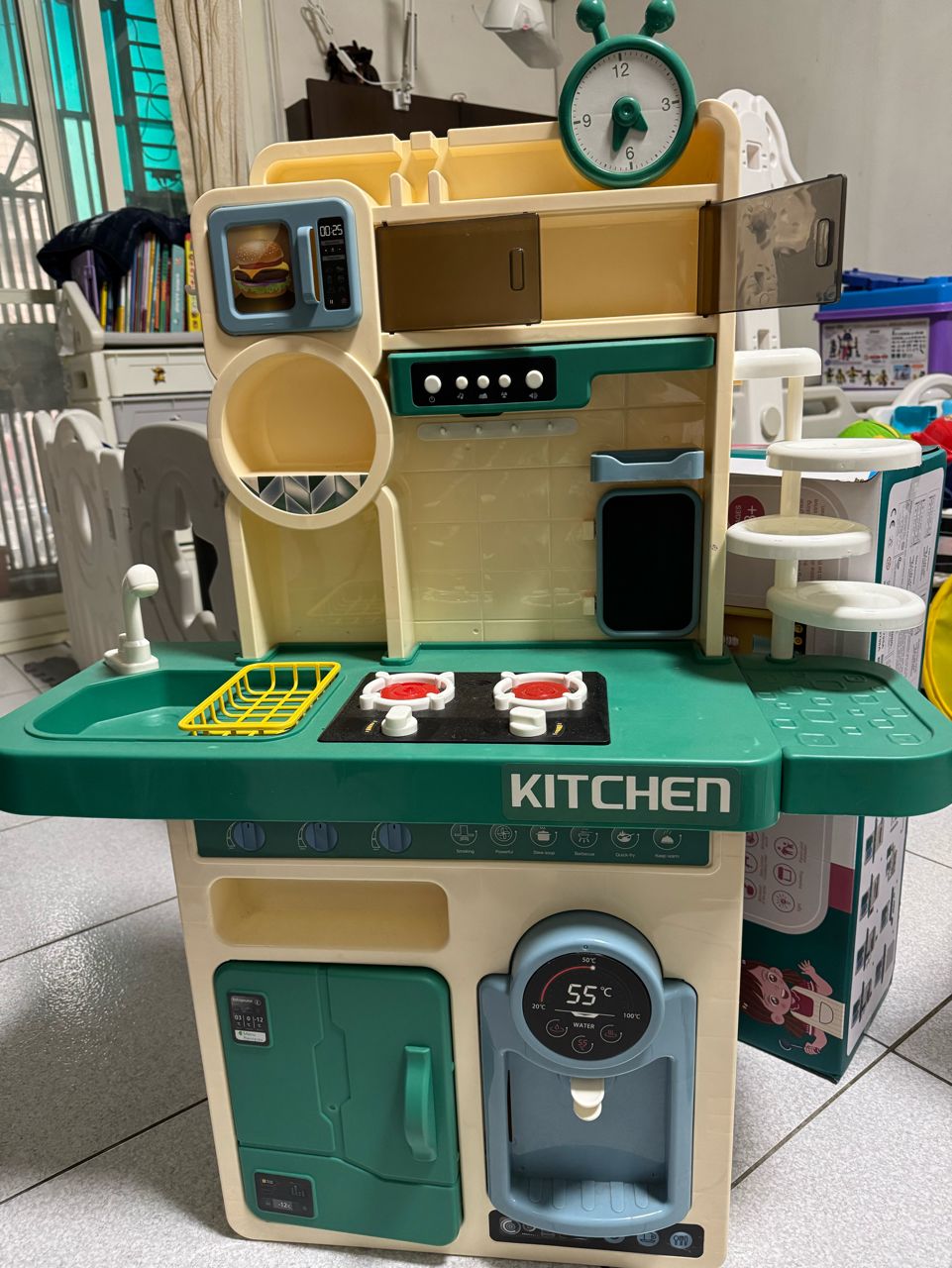 這組剛買時,小孩很愛,因為瓦斯爐真的會冒煙,且水龍頭跟飲水機真的可以出水,還有