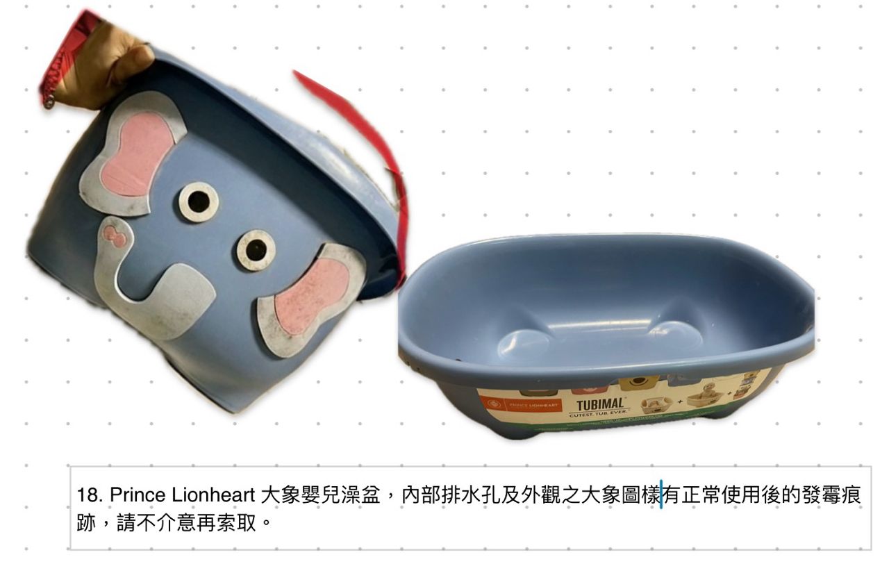 18. Prince Lionheart 大象嬰兒澡盆,內部排水孔及外觀之大象圖樣有正常使用後的發