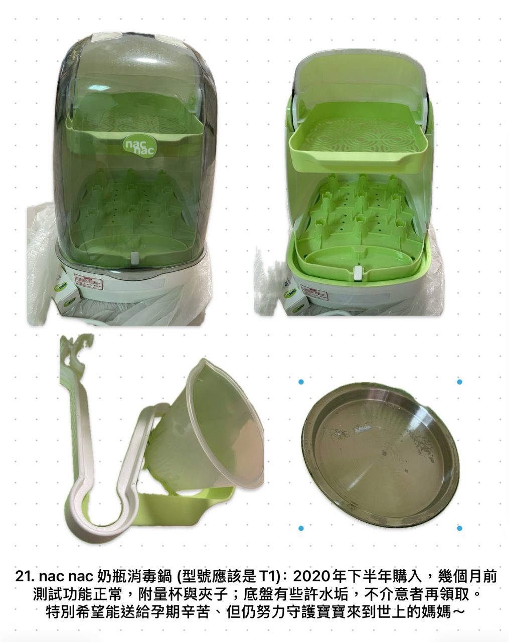 21. nac nac 奶瓶消毒鍋 (型號應該是T1):2020年下半年購入,幾個月前測試功能正常