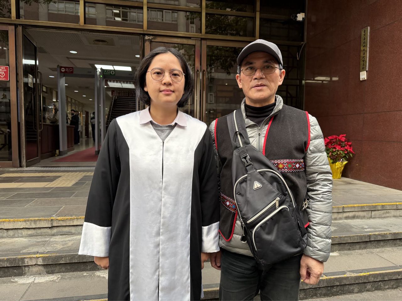中正國宅拆遷戶曾榮明(右)與律師林育萱(左)今至台北地方法院開記者會。記者林孟