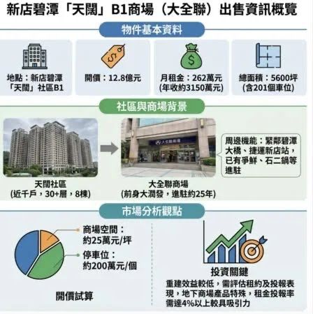 新店碧潭指標大型社區B1的「大全聯」以12.8億元開價刊售,該商場連同201個停車位廣