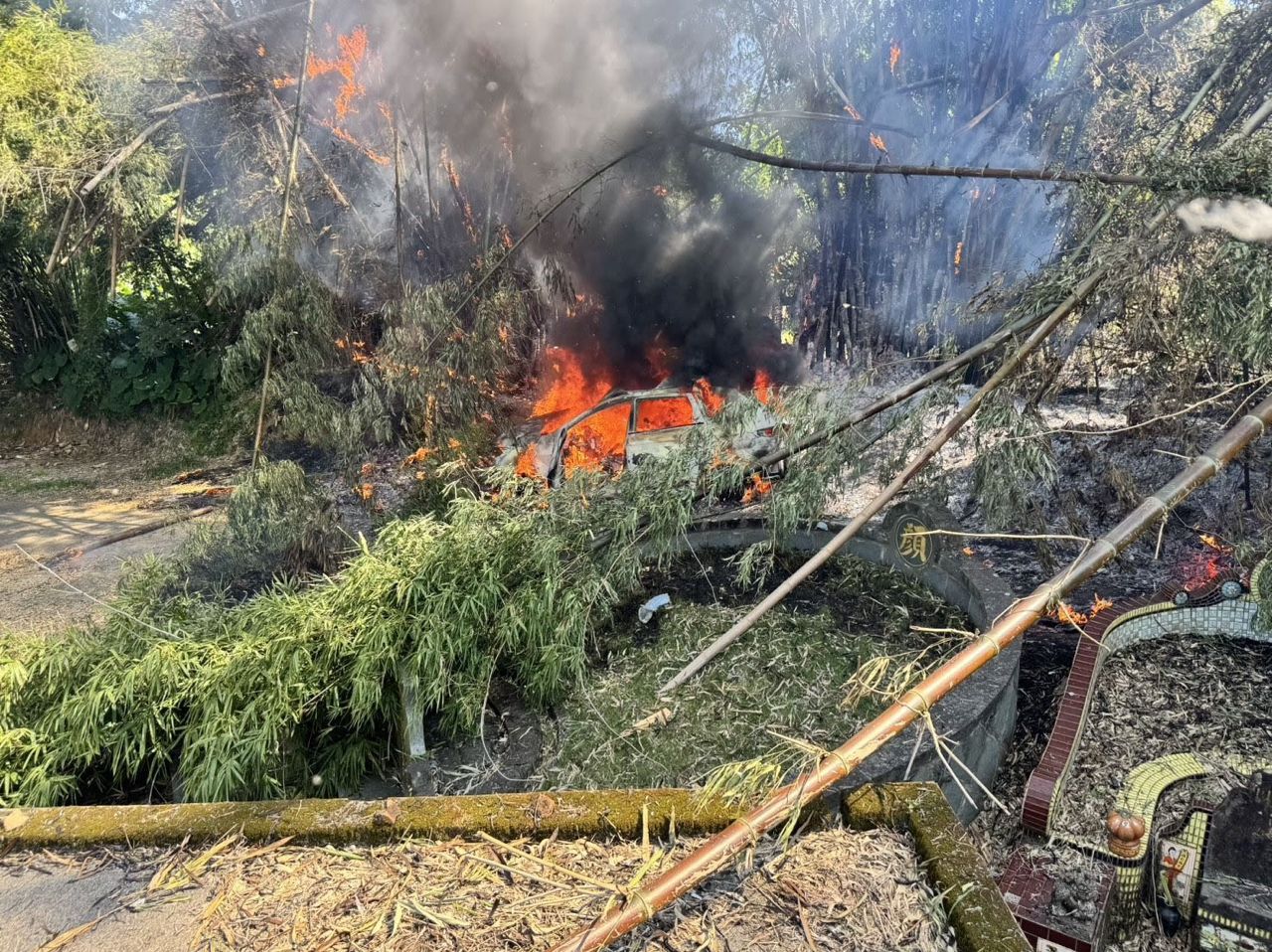 消防人員到場時樹林及休旅車正起火燃燒。記者黃子騰/翻攝