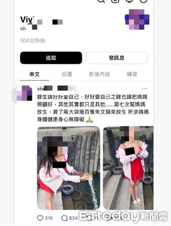 女網友屢次購買朱文錦放生,拍照發文稱「餘生請好好愛自己,也請把媽媽照顧好。第七