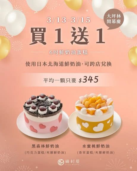 為了讓更多消費者感受到開幕的甜蜜喜悅,橘村屋特別推出 6吋鮮奶油蛋糕買一送一活