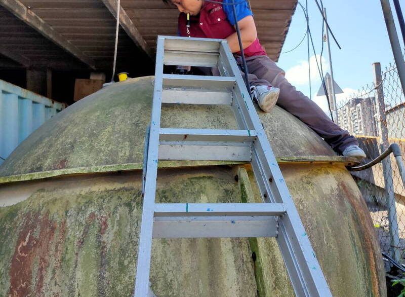 到場救援的動保員指出,現場發現小三花貓窩在廢棄大水桶的底部,水桶約有2公尺高,