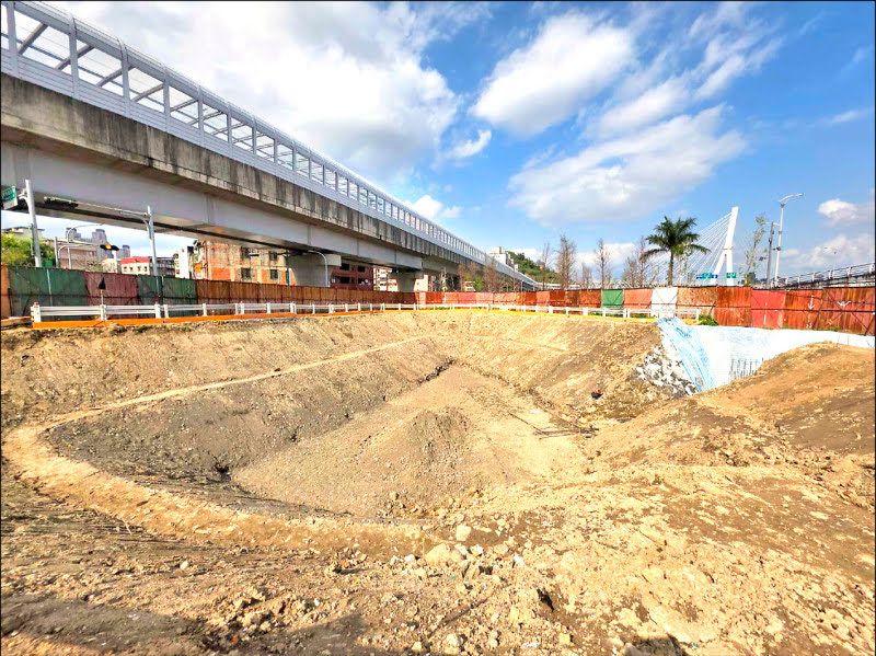 新店J單元區段徵收工程北側滯洪池施工現況。(新北市地政局提供)