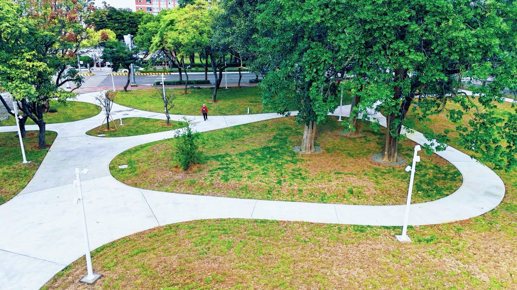 社區型綠地,其柔和弧形步道線條成功營造舒適、親和氛圍,成為竹北公園步道的美學基
