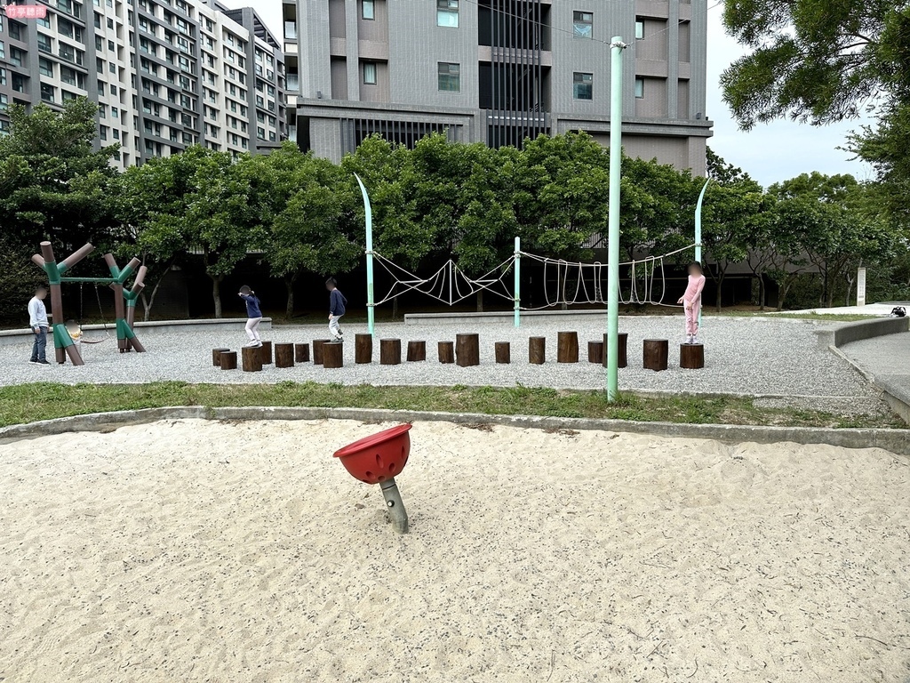 還有一個紅色的旋轉盤,後面是踩木樁遊戲~一腳一步考驗平衡感!
