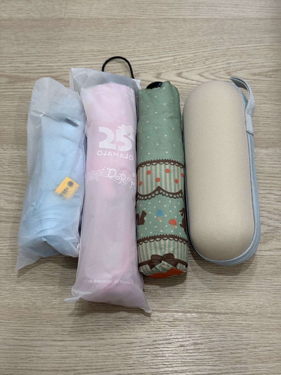 2. 折疊傘4支,其中有一隻有使用痕跡,內裡黑膠有局部脫落但仍可使用