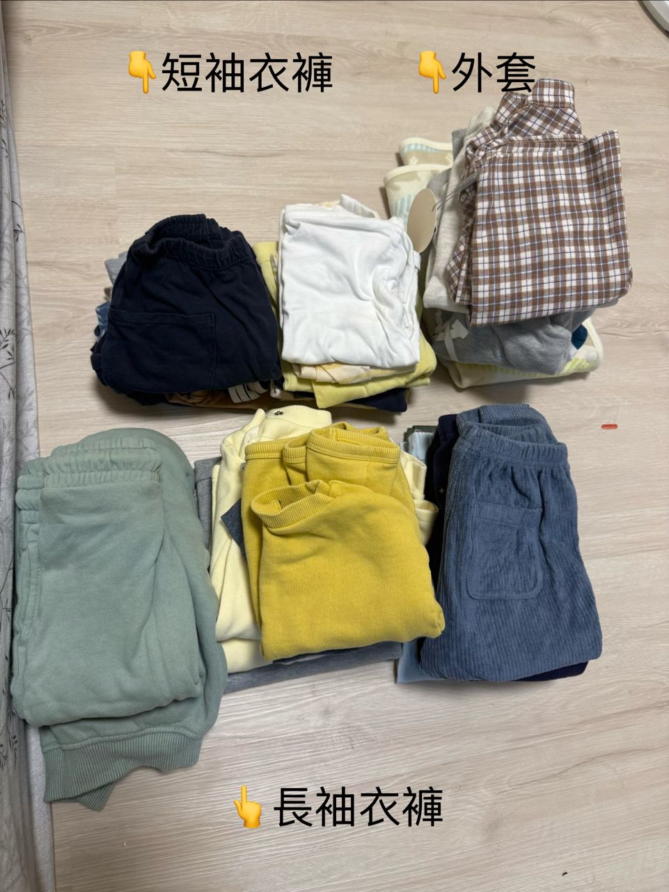 因家中小朋友已穿不下,欲贈出男童衣物,有長短袖、長短褲、外套和一件防踢被,全部